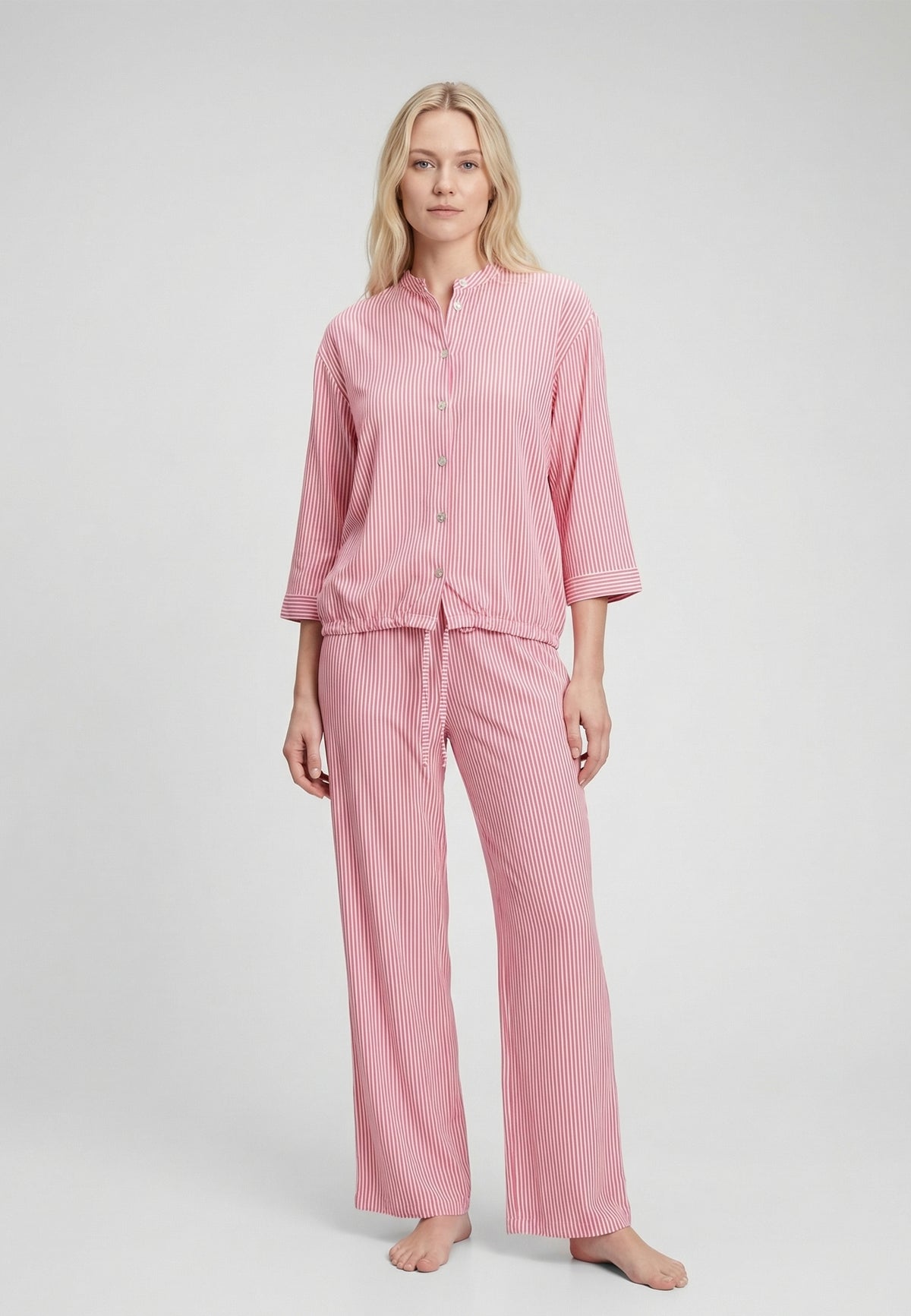 Pyjama femme composé d’un haut boutonné à manches 3/4 et d’un pantalon long assorti, décoré de fines rayures roses pour un style doux et élégant.