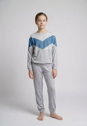 Pyjama enfant au style moderne avec détail chevron bleu, parfait pour les soirées cocooning.