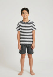 Pyjama garçon au style moderne et intemporel, composé d’un t-shirt rayé anthracite et blanc et d’un short assorti.
