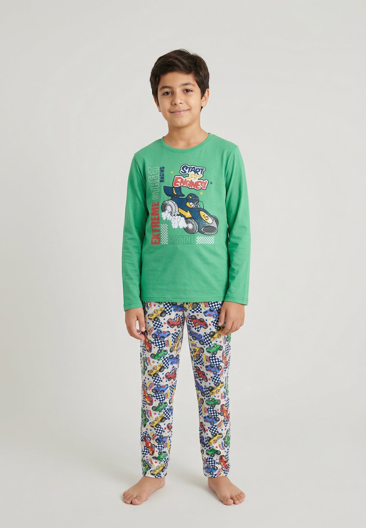 Pyjama garçon au style racing avec imprimé Start Racing et motif voitures colorées.