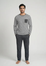 Pyjama homme au style moderne et intemporel, composé d’un haut rayé anthracite et blanc avec poche poitrine contrastée et d’un pantalon uni anthracite assorti.