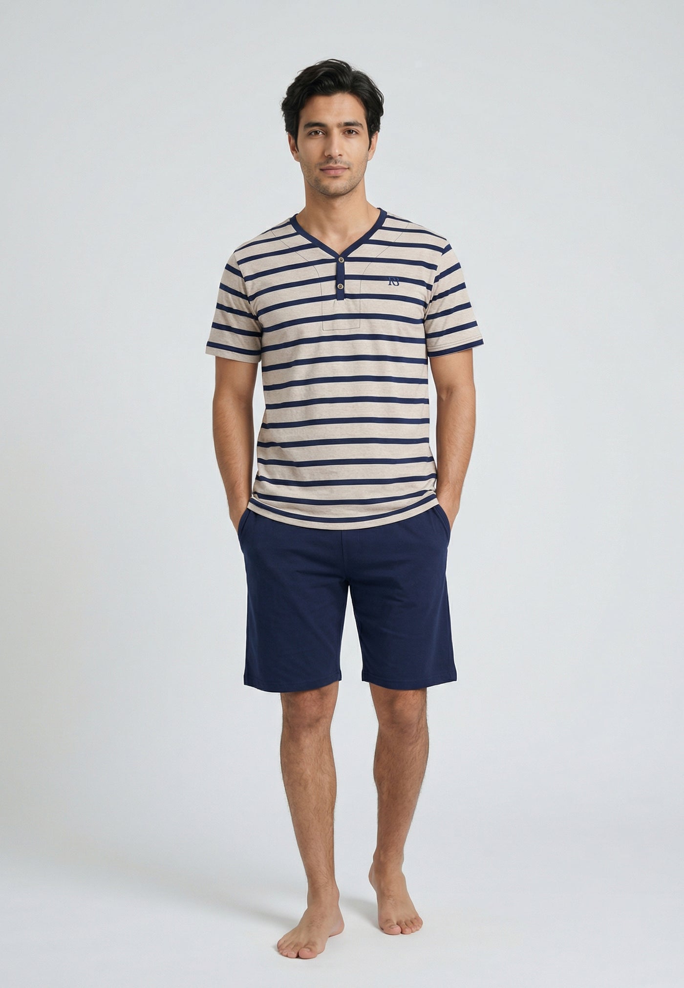 Pyjama homme moderne composé d’un t-shirt beige à rayures bleu marine avec col boutonné et d’un short bleu marine assorti pour un style à la fois élégant et confortable.