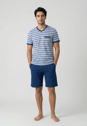 Pyjama homme confortable composé d’un t-shirt gris à rayures bleues avec col en V et poche poitrine contrastée, accompagné d’un short bleu marine assorti.